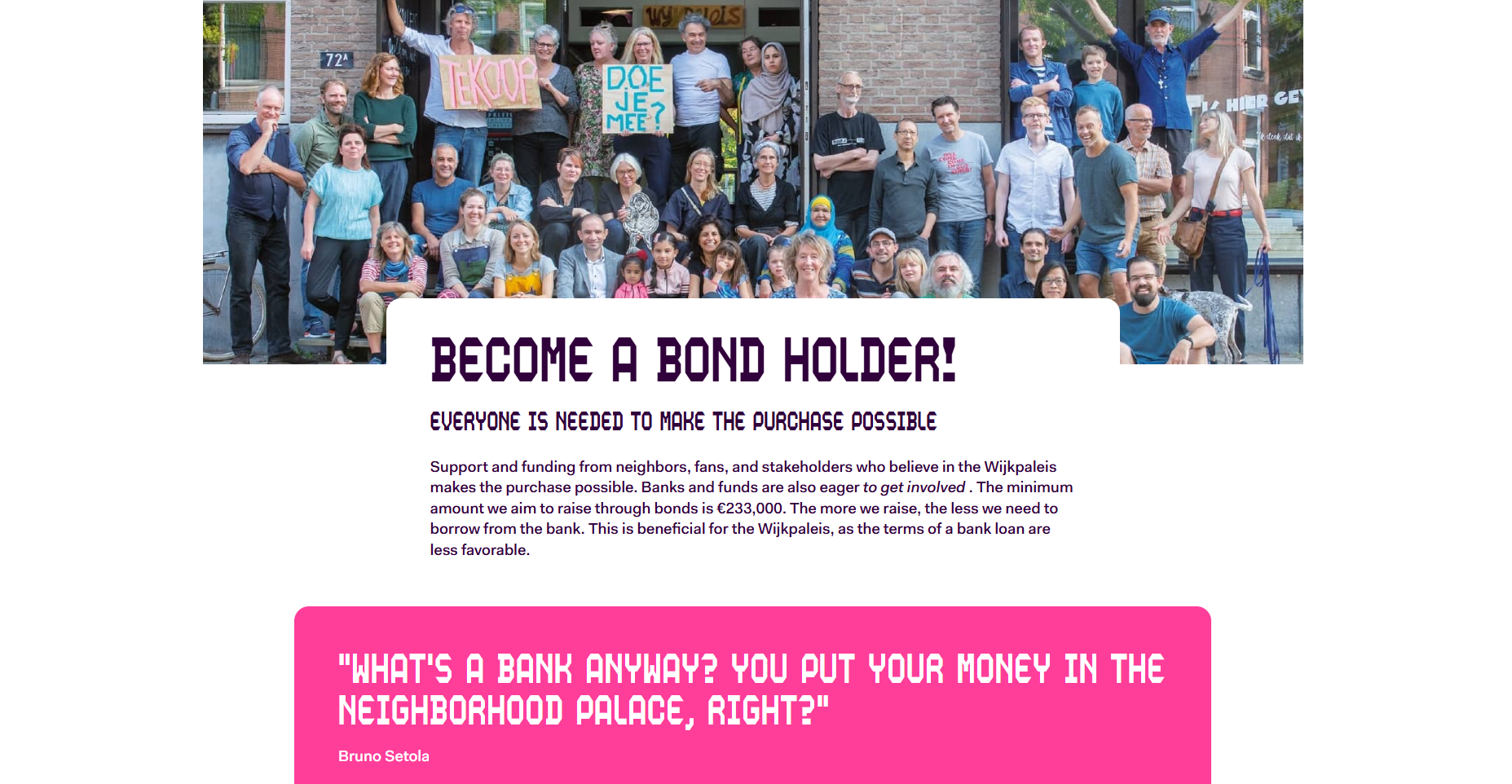 To raise funds for the eventual purchase of their building from the municipality, Wijkpaleis issued community bonds. Residents, neighbors and supporters could choose how much to lend and for how long. In return, they would receive an annual interest and eventually get their capital back.